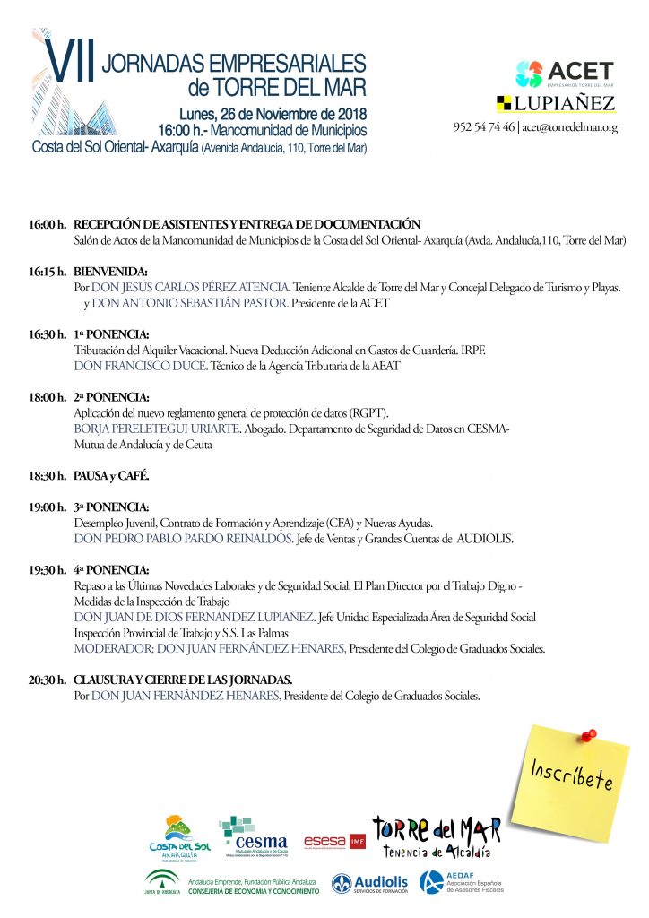 Este año se presenta las VII Jornadas Empresariales de Torre del Mar ACET-LUPIAÑEZ ASESORES, como todos los años pretendemos traer ponentes que de alguna manera nos expliquen las novedades que nos vamos a encontrar para el próximo año, tanto en el ámbito fiscal y laboral, tendremos la intervención de Don Francisco Duce, Técnico Tributario de la Agencia Tributaria de Málaga, anteriormente fue Jefe de la Sección del IRPF en Málaga y que nos hablará de las cuestiones controvertidas del Alquiler Vacacional y la nueva deducción adicional por maternidad que desde el 1 de Enero de 2018 existe para las madres trabajadoras, que incurra en gastos de guardería, así como otras novedades que fueron aprobadas en los PGE. Por otro lado y ya en el ámbito laboral, contaremos con la intervención de Don Juan de Dios Lupiañez Fernandez, Jefe de la Unidad Especializada Área de Seguridad Social, que este año hará un repaso a las últimas novedades Laborales y de Seguridad Social, además las medidas que a tomar la inspección en relación al Plan Director por el Trabajo Digno. También Don Borja Pereletegui Abogado de Mutua CESMA nos va hablar de las novedades en el Reglamente de Protección de Datos, especialmente dirigido a las empresas y asesorías y por último Don Pedro Pablo Pardo, Jefe de Ventas y Grandes Cuentas de Audiolis, nos hablara del Contrato de Formación y Aprendizaje.